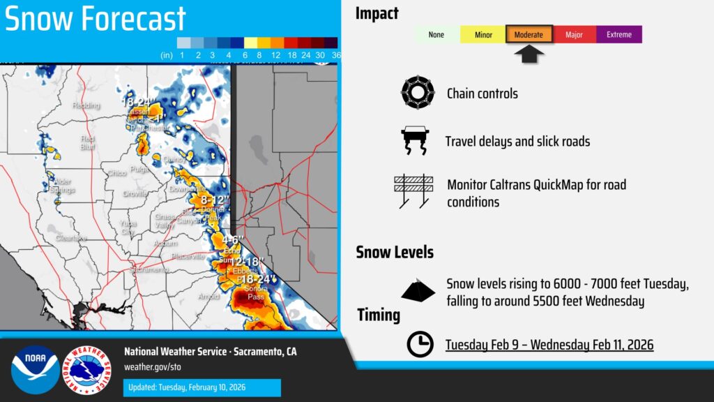 The biggest impact will be felt in the Sierra Nevada, where snow levels are forecast to drop quickly early this week. Travelers heading over Donner Pass along Interstate 80 could encounter slick roads, reduced visibility, and accumulating snow, especially Tuesday into Tuesday night.
